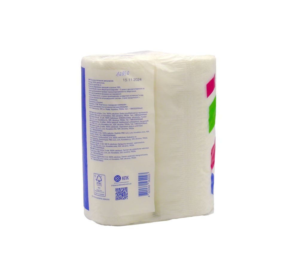 Производитель Украина Бренд Papero Емкость 100 отрывов Цвет Белый Количество слоёв 2 Количество в упаковке 2, шт. Материал Целлюлоза Тип Рулон на гильзе