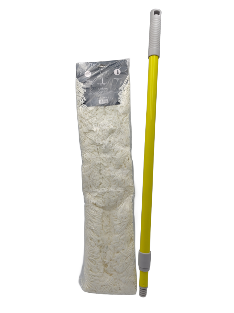 - Швабра веревочная — ее рабочая часть состоит из множества длинных веревок или нитей, обычно сделанных из хлопка, микрофибры или другого впитывающего материала. Они прикреплены к ручке, сделанной из пластика или дерева.