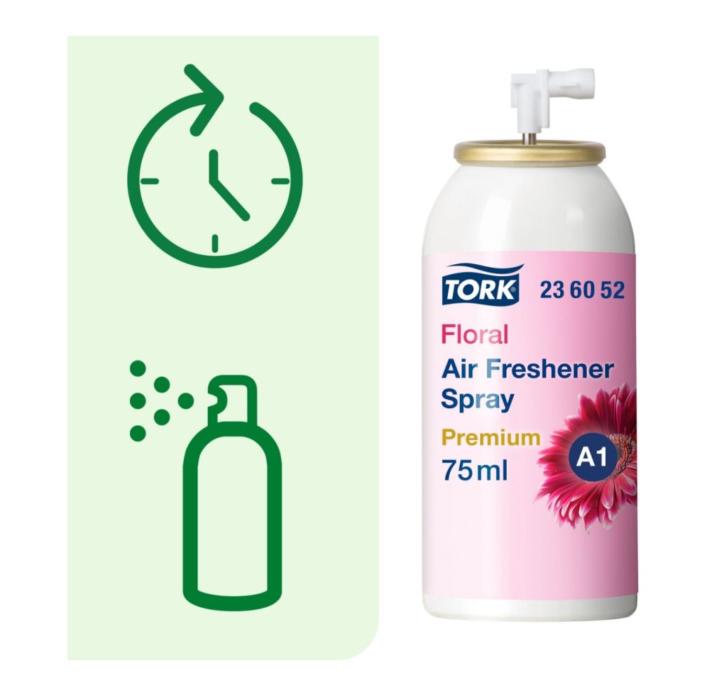 Ефективно і успішно контролюйте запах в туалетній кімнаті з аерозольним освіжувачем повітря Tork з квітковим ароматом. Аерозоль містить концентровані ароматичні масла і нейтралізуючі запах речовини, які усувають неприємні запахи і довго підтримують в приміщенні свіжість. Підходить для використання в диспенсерах для аерозольного освіжувача повітря Tork.