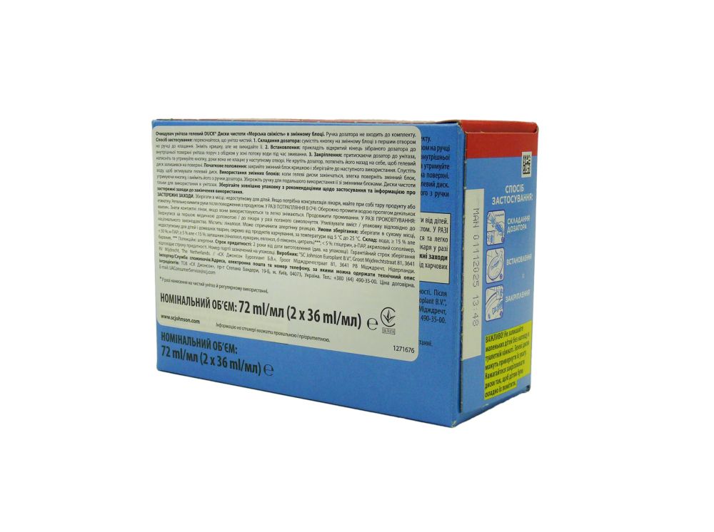 Використовуйте зі стандартним багаторазовим аплікатором Duck. Притисніть аплікатор до внутрішньої сухої поверхні чаші унітаза та видавіть один гелевий диск. Диск буде поступово розчинятися при кожному змиванні.