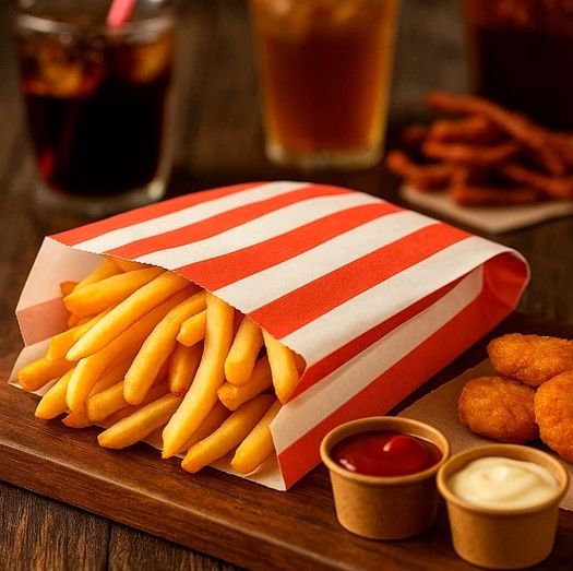 Паперові пакети – це практичне рішення для фастфуду. Ви можете купити паперовий пакет Червоні смужки 160х120х50 мм не тільки для популярної страви з картоплі, але також для міні-піци, бутерброду, сендвічу, круасану, паніні і т.д. У такий пакет зручно фасувати гарячі страви та подавати їх у різних закладах, щоб клієнти не бруднили руки та могли перекусити прямо на ходу.